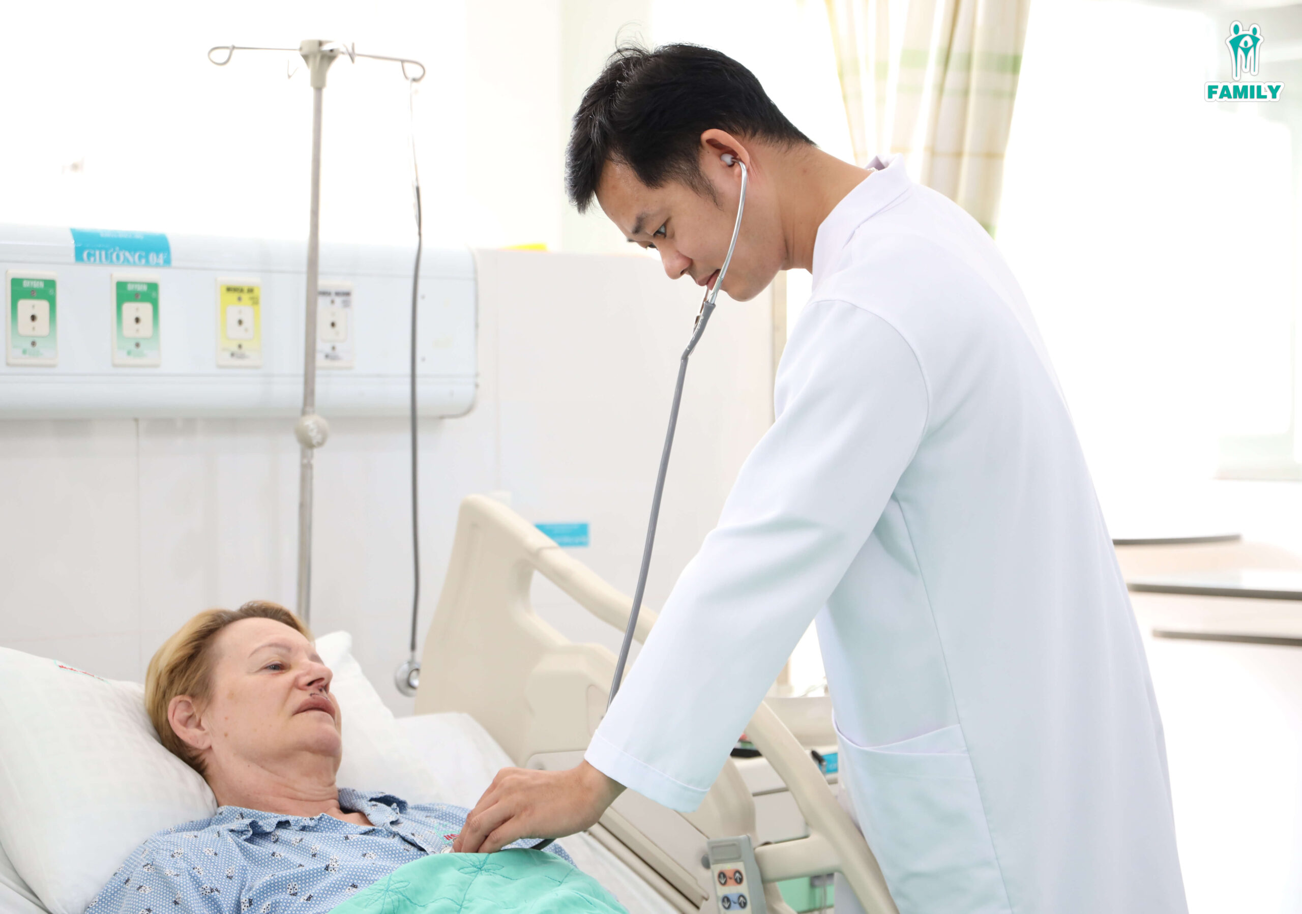 Bác sĩ Khoa Hồi sức Cấp cứu Đột quỵ thăm khám cho bà C. M. Williams sau can thiệp